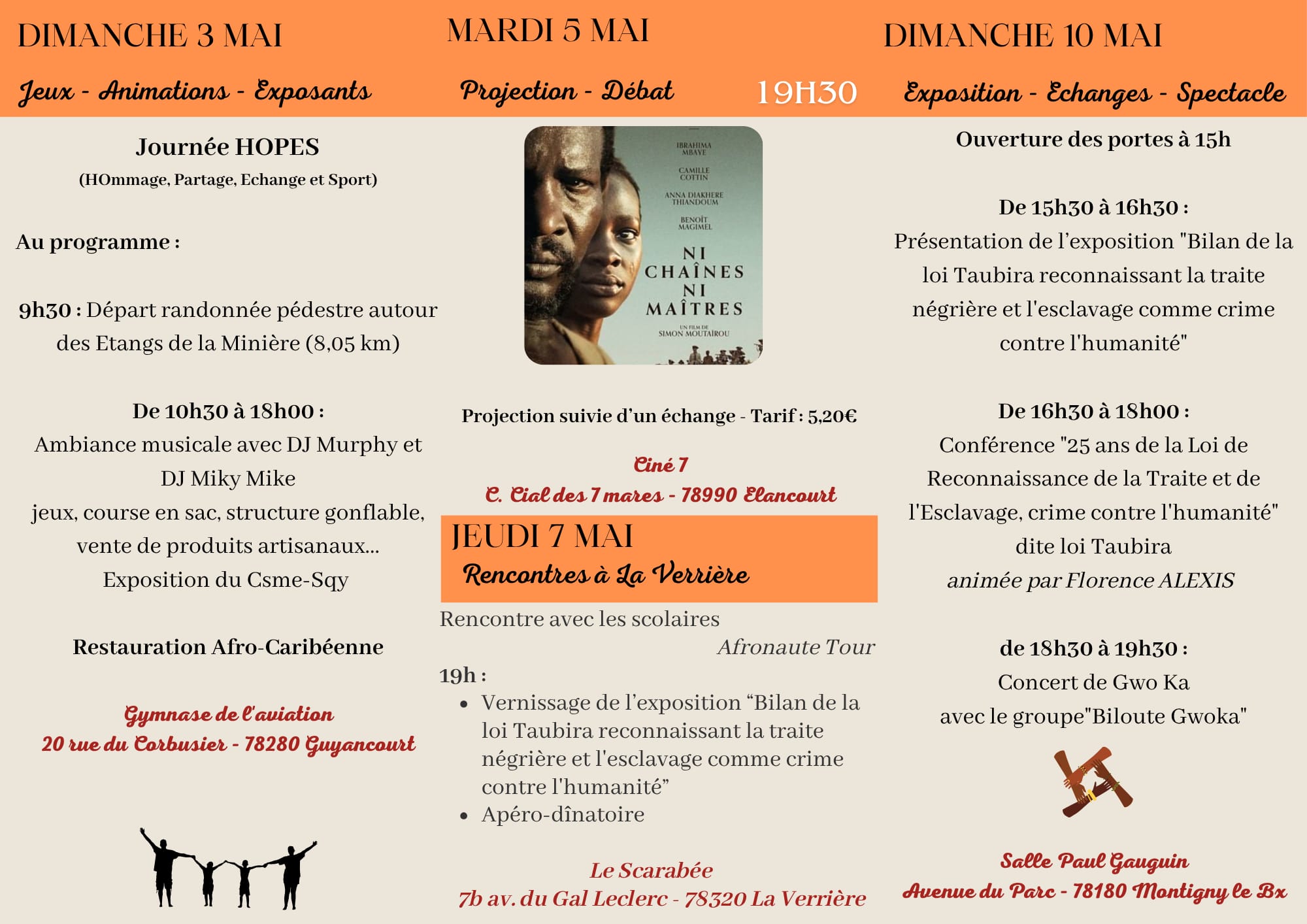 Membre du Collectif pour la Semaine de la Mémoire de l’Esclavage à St-Quentin-en-Yvelines (CSME-SQY), CTOM participe pleinement aux évènements organisés autour des 25 ans de la loi Taubira (« Esclavage crime contre l’Humanité » – 2001). Hommages, projection-débat, conférence, rencontre avec les élèves, exposition « Bilan de la loi Taubira », une série d’activités, d’évènements pour commémorer, réfléchir, prendre conscience et oeuvrer pour le mieux vivre-ensemble. Dans plusieurs villes de l’agglomération … ca commence le 3 mai à Guyancourt. Le programme complet ici.