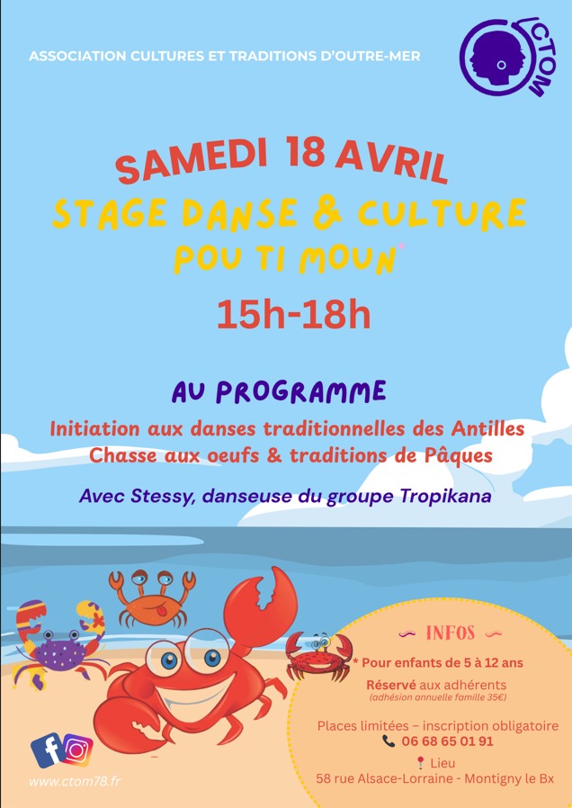 Initiation aux Danses traditionnelles, Activités autour de Pâques en Créole, Goûter + Chasse aux oeufs. Le stage est animé par Stessy, professeure de danse et danseuse du groupe Tropikana.